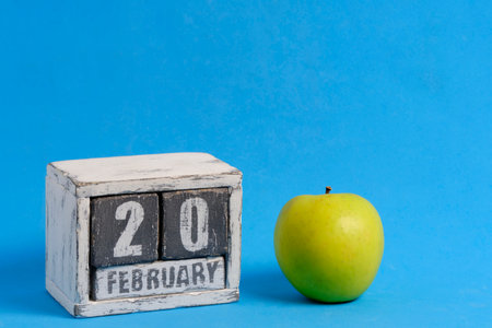 February 20th on wooden calendar and green apple on blue background. Apple Day USA