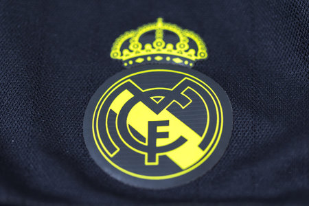 Yellow shield on the gray shirt of Real Madrid Football Club. Uefa champions league final concept on May 28, 2022, champion, europe, league, spain.