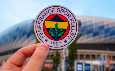 September 12, 2021, Istanbul, Turkey. The emblem of the football club Fenerbahce against the background of the modern stadium.