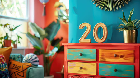 Wooden number 20 on a colorful dresser in a teenager vibrant bedroom
