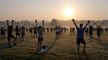 Group of performers stretching on a grassy field in the early morning light with an open horizon view and a rising sun at the background