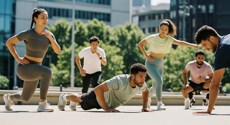 Diverse group exercising outdoors in a city park, performing push-ups in unison, wearing athletic clothing, urban background with greenery.