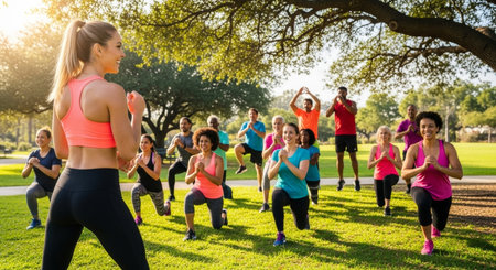 Participants stretch and smile in a park as a young woman leads a lively fitness class. The atmosphere is filled with energy and positivity, encouraging a healthy lifestyle.