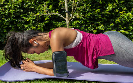 Slender female athlete shakes the press standing on plank