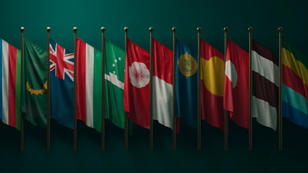 Flags of different countries on flagpoles