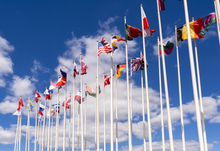 National flags of many countries on flagpoles, international cooperation concept
