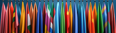 Diverse national flags hanging, representing global unity
