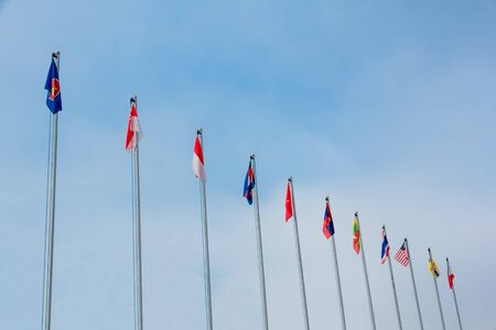 View of national flags of Southeast Asia countries; Myanmar / Burma, Malaysia, Laos, Indonesia, Cambodia, Brunei Darussalam.