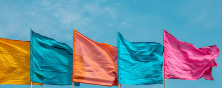 Brightly colored flags flutter against a clear sky, showcasing vibrant hues of yellow, orange, blue, pink, and turquoise.