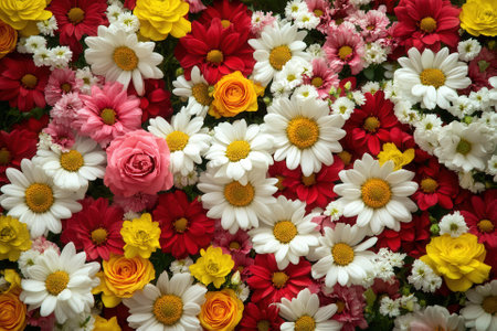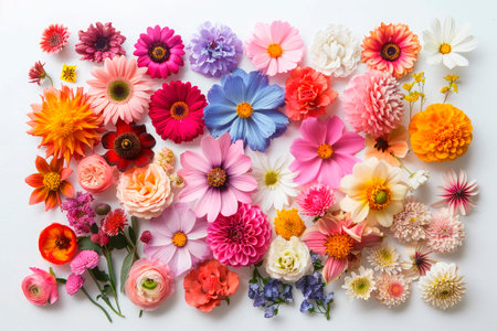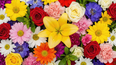 A vibrant collection of colorful flowers, including roses, daisies, and dahlias, arranged in a beautiful floral pattern.