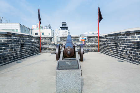 A old iron cannon at the Janganmun Gate, Korea traditional landmark in the city of Suwon of South Korea. Hwaseong Fortress is an historic building in Joseon Dynasty.
