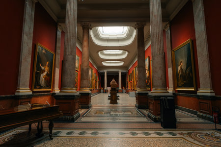 Art enthusiasts wander through a spacious gallery, admiring vintage artworks displayed against soft blue walls. The grand architecture enhances the atmosphere of culture and creativity.