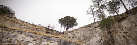 Vector illustration is showing steep limestone cliff with dry grass and pine trees under cloudy sky. Cliff, elevation, nature, outdoor, rugged, adventure, wilderness
