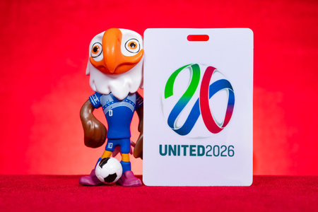 ZHONGSHAN China-November 16 2025: mascot Clutch for the 2026 FIFA World Cup and a World Cup trophy card on red at horizontal composition.