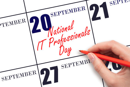September 20. Hand writing text National IT Professionals Day on calendar date. Save the date. Holiday. Important date. Day of the year concept.