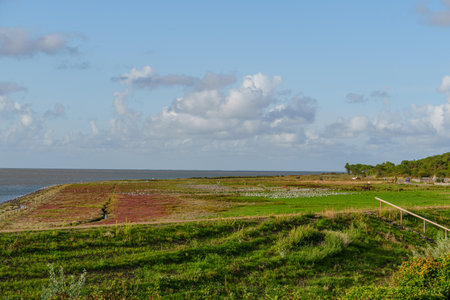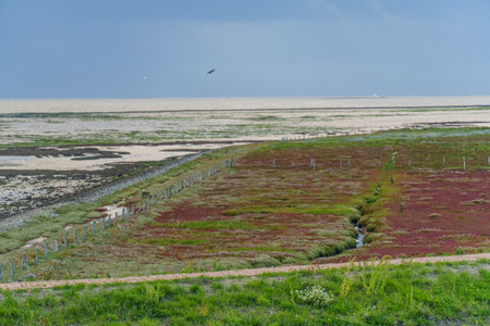 Wadden sea on the island Romo in Denmark, intertidal zone, wetland with plants, low tide at north sea