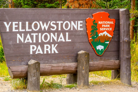 Yellowstone National Park, WY, USA - August 31, 2018: A welcoming signboard at the entry point of preserve park