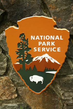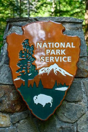 North Cascades National park, United States: July 31, 2019: National Park Service Sign on a stone pillar in the Washington park