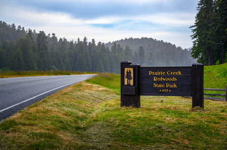 Welcome sign at the entrance to Prairie Creek Redwoods State Park in California