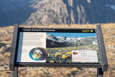 Colorado, USA - September 20. 2020: Storyboard sign for the Forest Canyon Overlook, a high elevation tundra area in Rocky Mountain National Park