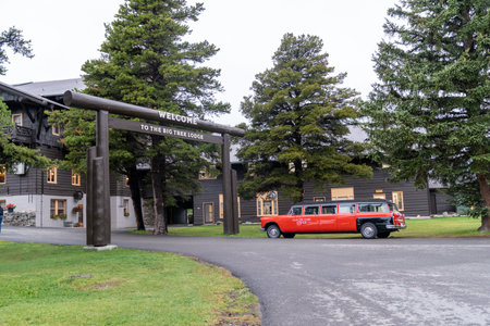 East Glacier, Montana - July 3, 2022: Red car in front of Glacier Park Lodge was built in 1913 by the Glacier Park Company, part of the Great Northern Railway.