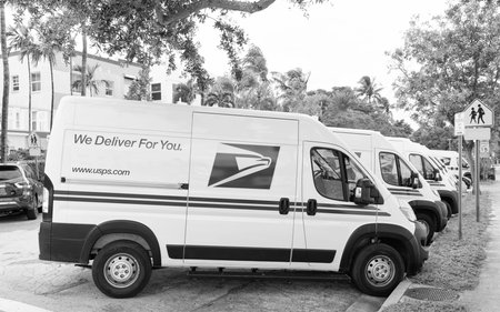 Miami, Florida, USA - November 18, 2024: Delivery USPS truck of postal service. Truck of mail delivery parked in the street. USPS mail delivery truck, side view. USPS truck