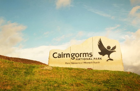 Cairngorms national park sign in a blue sky, in Scotland, UK