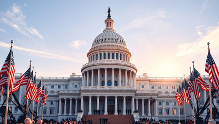 American flags on three flagpoles, white capitol building in the background
