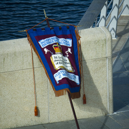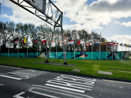 Dublin, Ireland - October 21, 2025: Row of flags along a fence surrounds a green field beside a road in Dublin, Ireland.