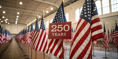 Indoor patriotic display with rows of American flags in large hall celebrating USA anniversary with national colors and formal atmosphere. Symbol of freedom unity and heritage.