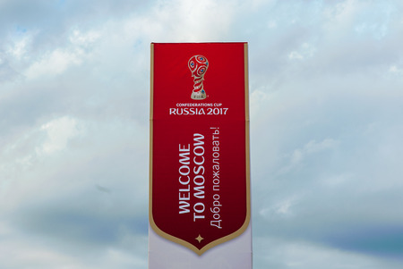 Russia, Moscow June 8, 2017 Information stand with the symbols of the FIFA Confederations Cup 2017 at the Spartak stadium in Moscow.