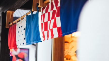Festive decoration flags of different colors hanging with string. Decorative plastic.