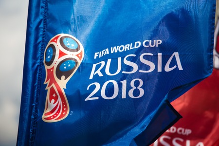Moscow, Russia - June, 2018: Flag waving with official logotype of Russia Fifa 2018 cup in Moscow city