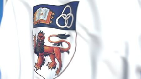 Waving flag with National University of Singapore emblem, close-up. Editorial 3D rendering