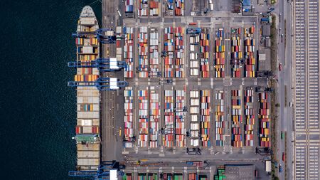 Aerial top view container ship in export and import business and logistics. Shipping cargo to harbor by crane.