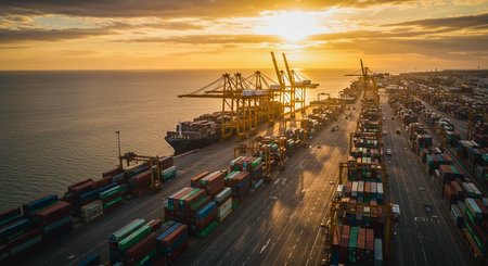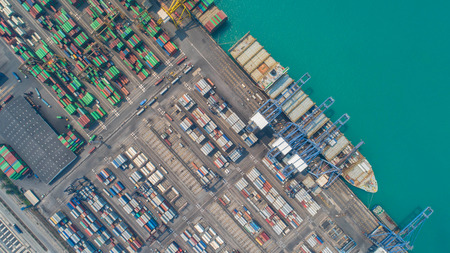 Arial view of Barcelona industrial port with shipping container