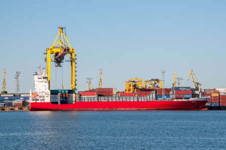ODESSA, UKRAINE - AUGUST 10, 2021: Loading a container ship at seaport. Industrial commercial containers at sea loading container terminal. Merchant fleet, cargo transportation. Marine logistics
