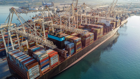 Container ship in export and import business and logistics. Shipping cargo to harbor by crane. Water transport International. Aerial view