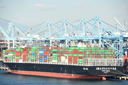 Container cargo ship at industrial port in import export business logistic and transportation international by container cargo ship freight shipping, Global cargo freight shipping logistic.