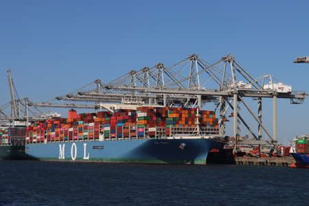 MOL container ship unloading containers at the Maasvlakte harbor in the Port of Rotterdam