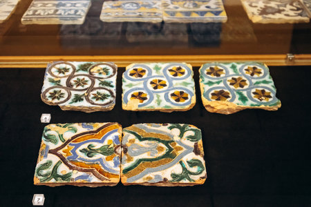 Lisbon, Portugal - December 28, 2024: Close-up of traditional azulejo tiles in the antique shop Authentica in the Alfama district of Lisbon