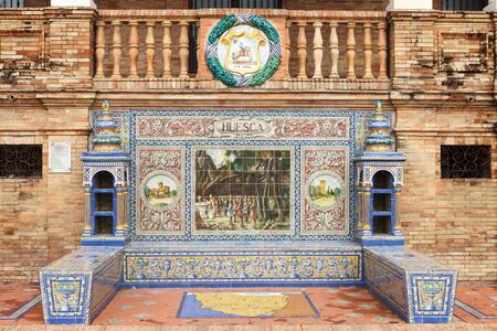 Symbol of Huesca. Coat of arms, map and decorative panels on Plaza de Espana (Spain Square) in Seville, Andalusia, Spain.