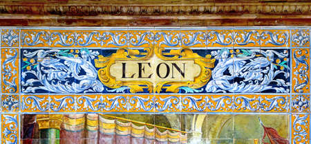 Tile with the name of the spanish city of Leon on ceramic with a colorful decoration located in Spain Square in Seville