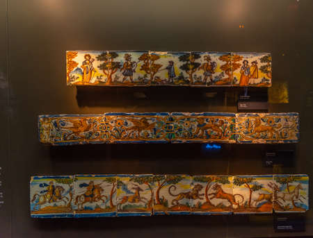 LISBON, PORTUGAL - FEBRUARY 2, 2019: ancient medieval XIV century portuguese azulejo, traditional painted tile with a wolf, or dog, in Lisbon National Tile Museum on february 2, 2019