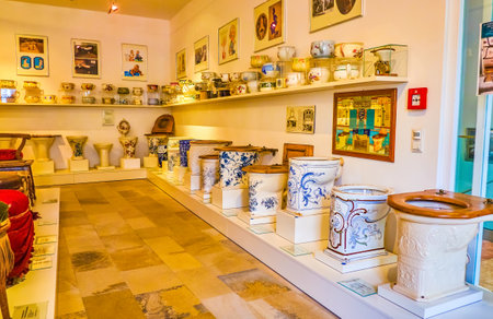 GMUNDEN, AUSTRIA - FEBRUARY 22, 2019: The ceramic exhibition in K-Hof Kammerhof museum with amazing historical ceramic sanitary ware, on February 22 in Gmunden