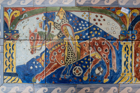Detail of colorful ceramic tiles in the Museum of Art, Moscow, Russia