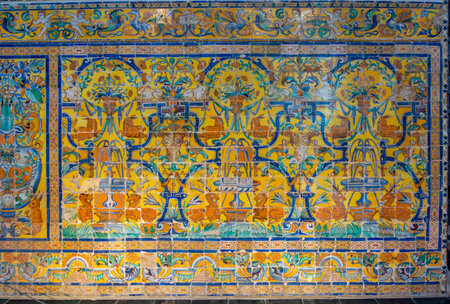 SEVILLE, SPAIN - 07 APRIL, 2019: The mosaic panno on the walls of the Plaza de Espana in Seville, a big tourist center in Spain