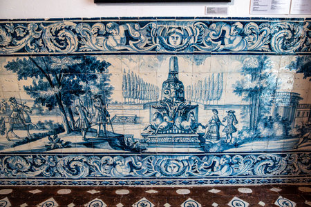 Interior with the walls decorated with cobalt-blue tiles called azulejos of the House of the Holy Body in Setubal, Portugal