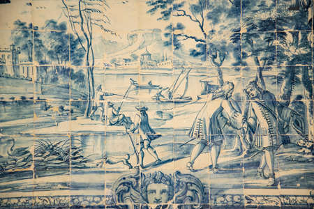 Portuguese azulejo ceramic tiles, closeup photo of decorative, vintage, historic azulejos.