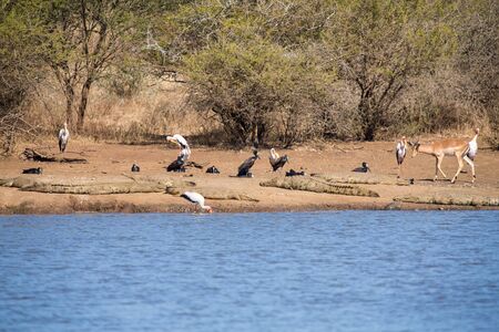 Group of female kudu antelopes at waterhole in African savannah. Safari game drive in South Africa